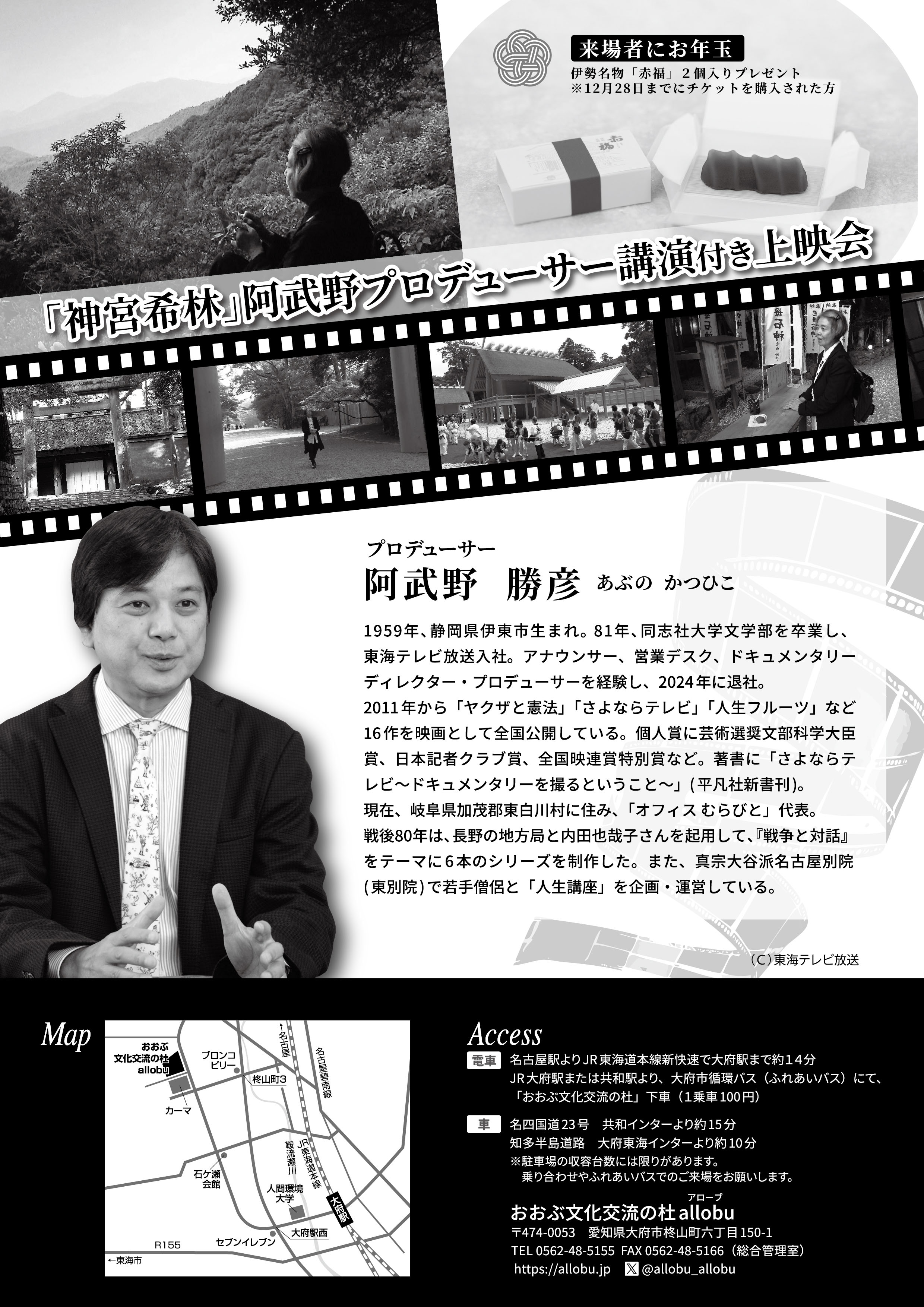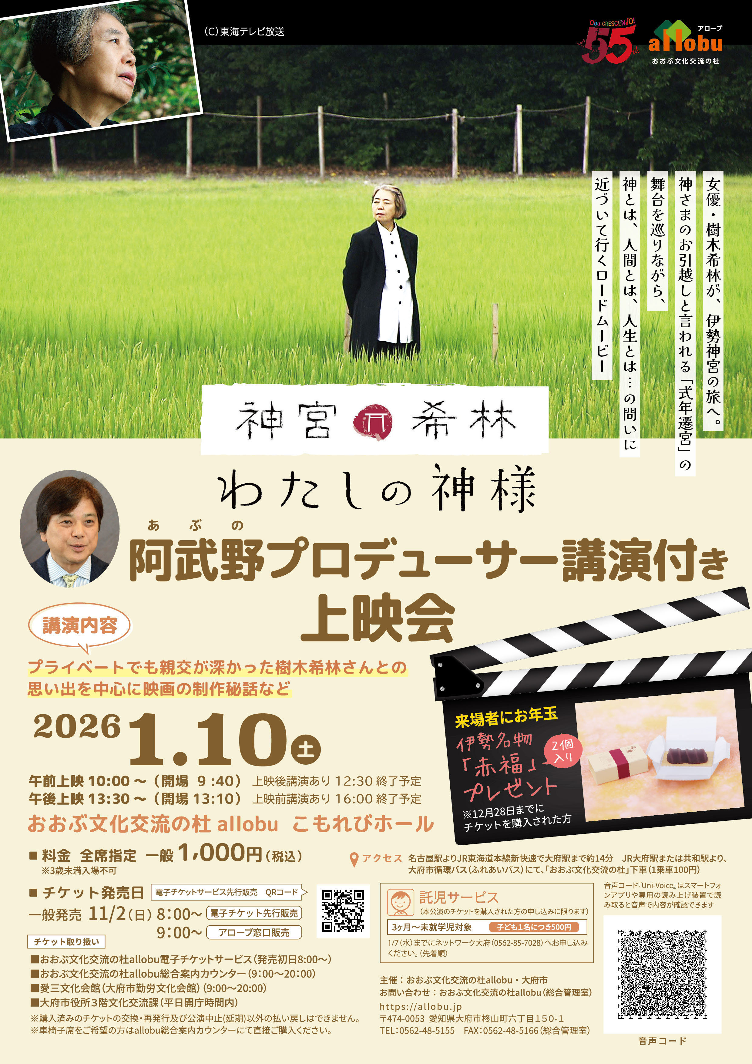 女優・樹木希林が、伊勢神宮の旅へ。神さまのお引越しとも言われる「式年遷宮」の舞台を巡りながら、神とは、人間とは、人生とは・・・の問いに近づいて行くロードムービー。プロデューサー阿武野勝彦さんによる講演付き上映会。赤福2個のお土産付き。