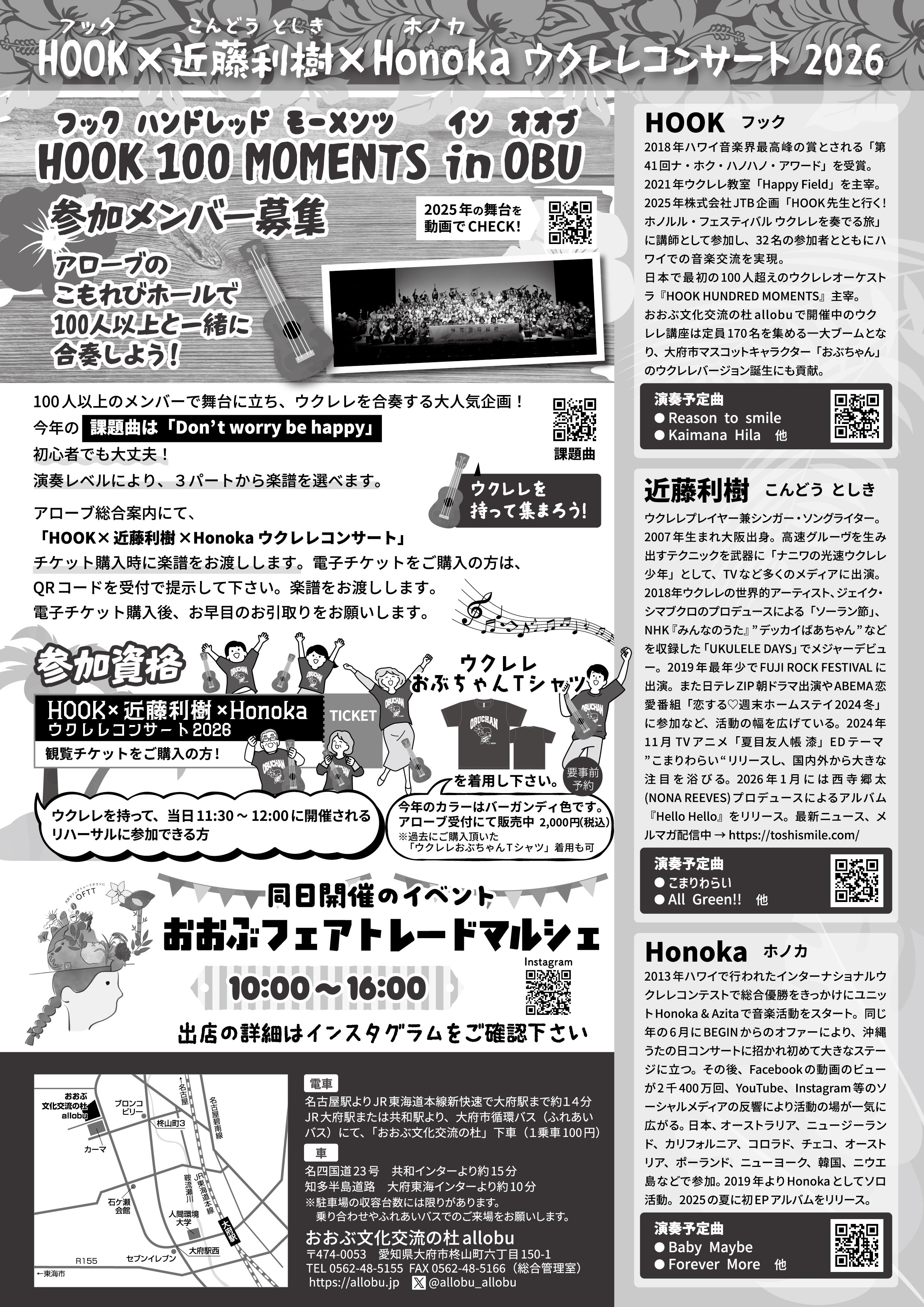 一般の参加者100人以上が一緒にホールの舞台に立ち、ウクレレを合奏する人気企画《HOOK 100 MOMENTS in OBU》も開催します。